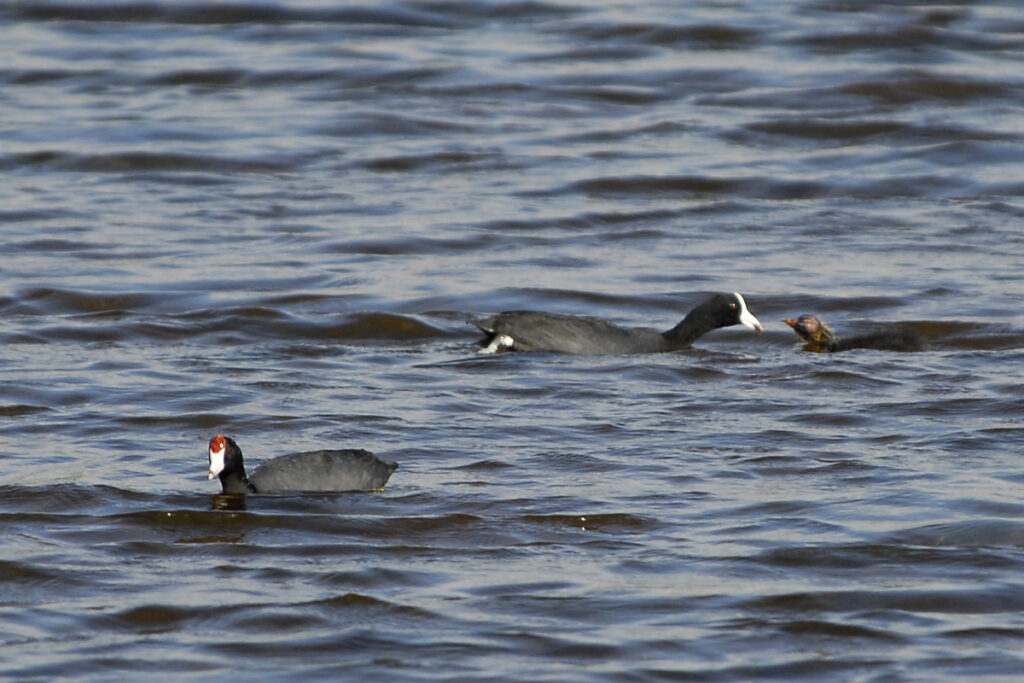 Alae Keokeo at Salt Pond. The one with the chick has the more common white forehead. The other one has a red spot on the forehead which is rare. Kauai 2008