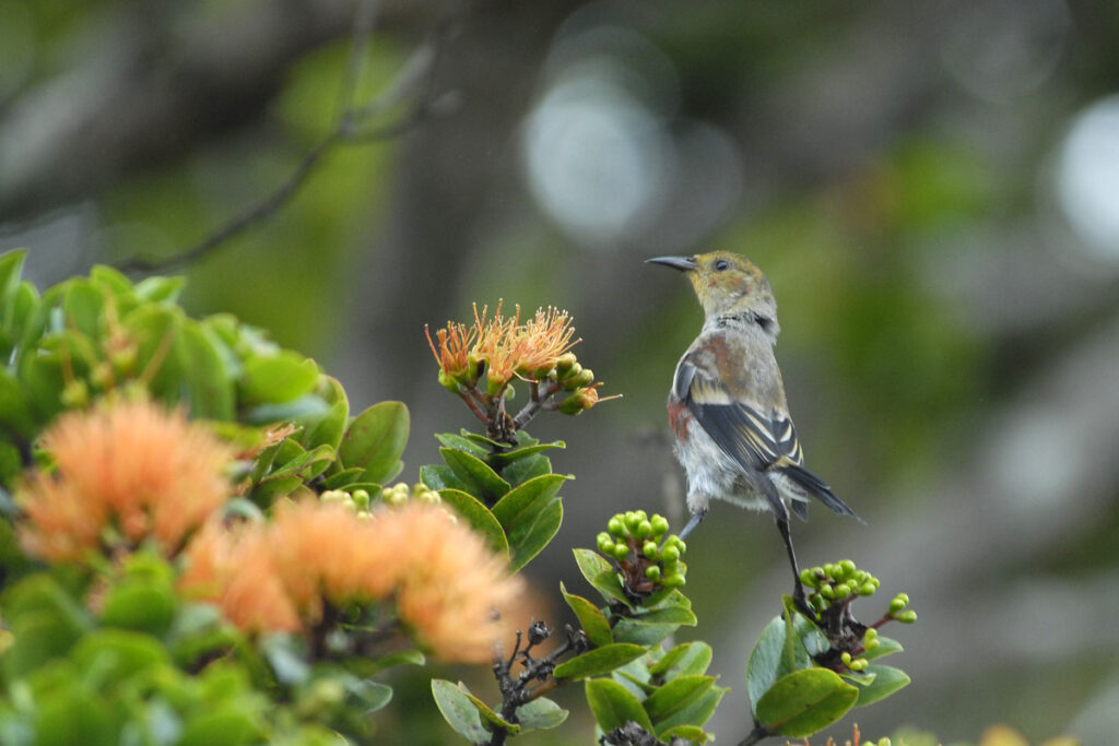 A juvenile Apapane feeding on yellow lehua. The Apapane is the most common of the Hawaiian Honeycreepers. Kauai 2007