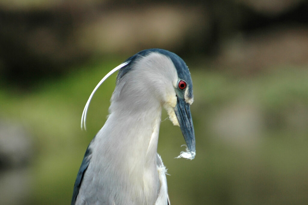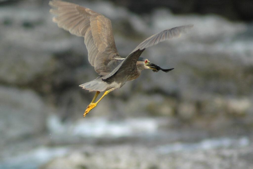 A Black-crowned Night Heron by the ocean with a blenny in its bill. Kauai 2005