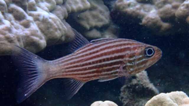 The Blackbar Damsel is brown with yellow pectoral fin, black bar and a white tail. They like to hide in the branching coral heads. Amami 2023