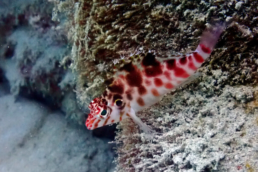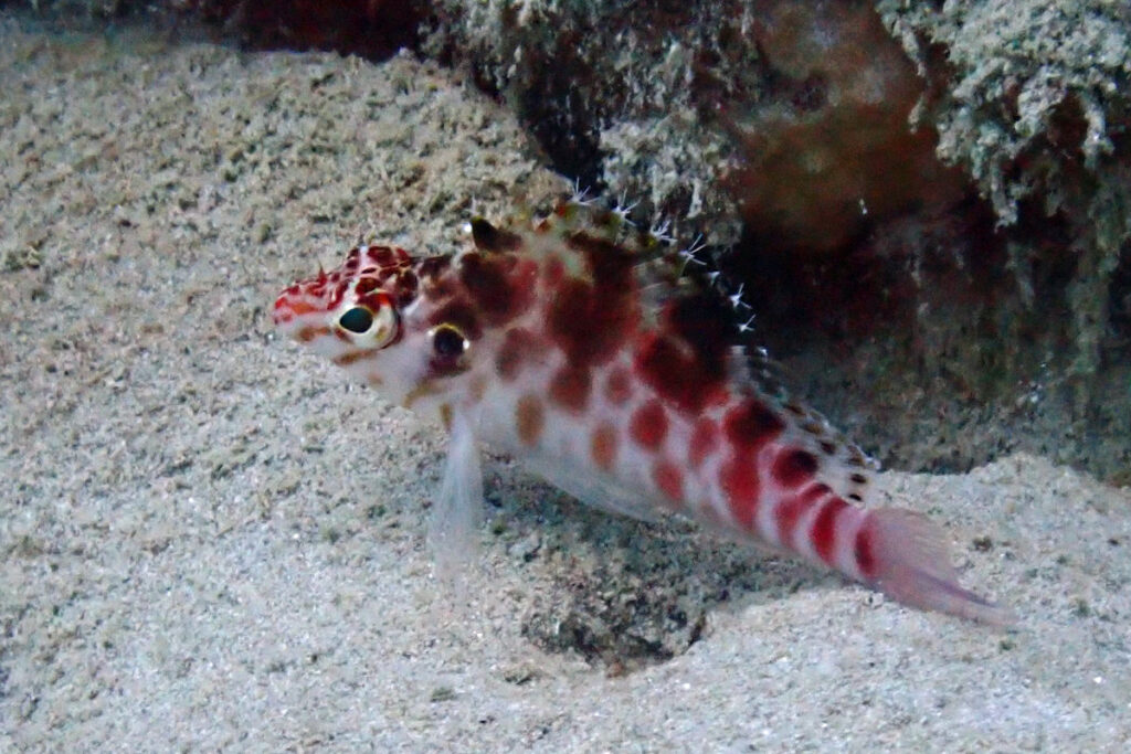 Another photo of the same Blotched Hawkfish. It has tufts on the top of its spines. The similar Dwarf Halkfish and the Redspotted Hawkfish also have tufts on their spines. Amami 2025