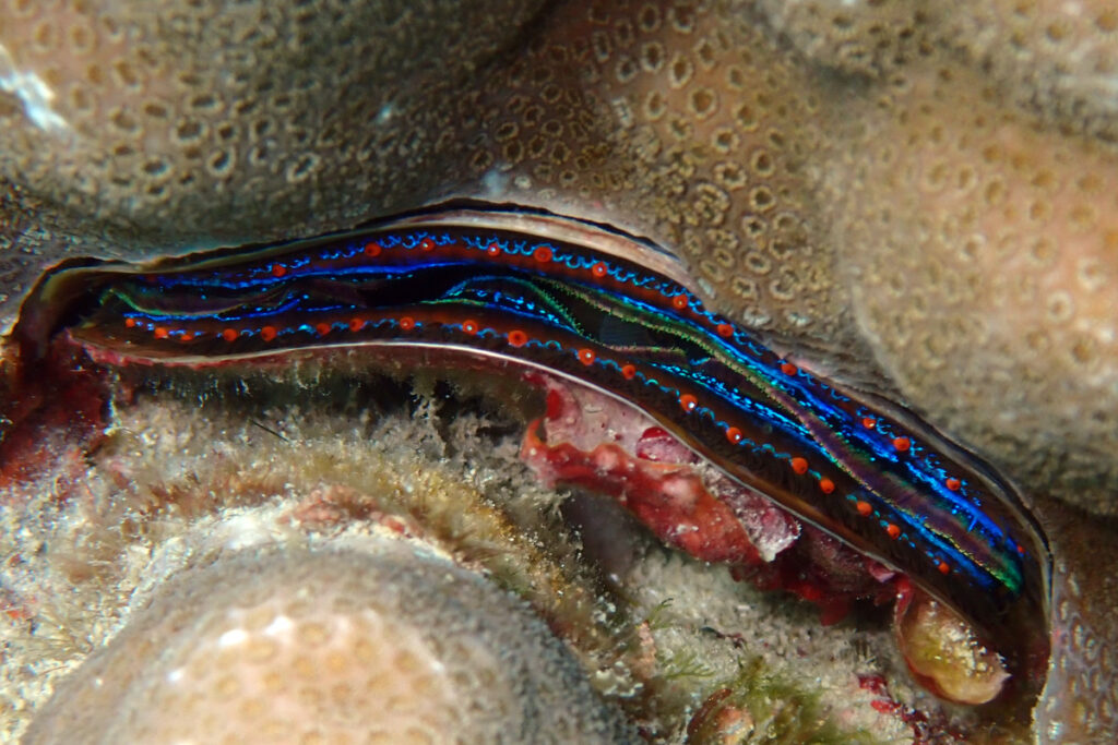 Boring Scallop in Porites coral. They are fairly common, but they like to close when you get close. Amami 2026