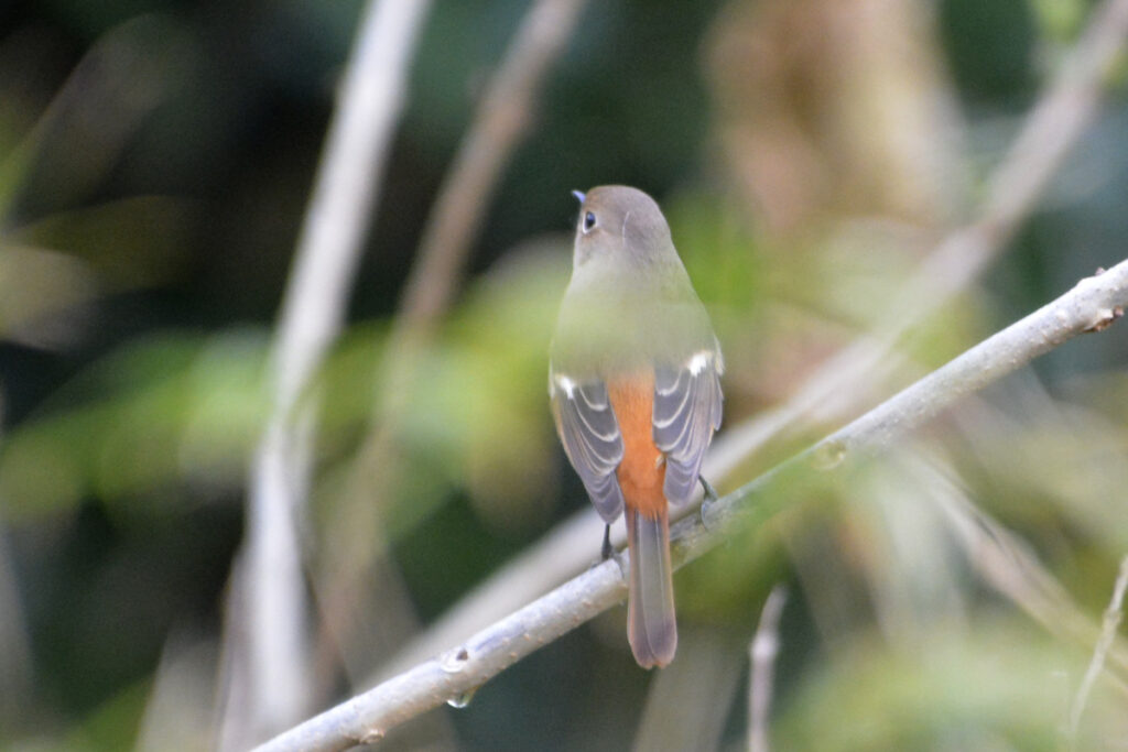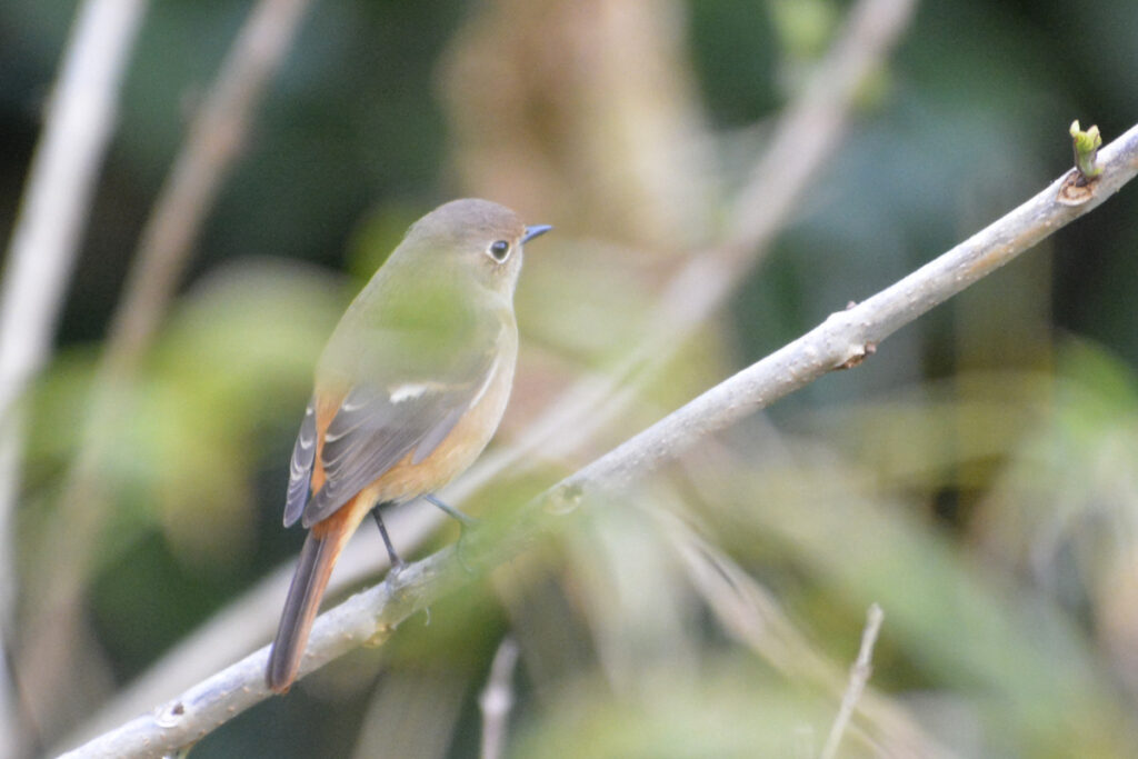 A female Daurian Redstart behind my house. The green blotch is a leaf in front of the Daurian Redstart. Amami 2026