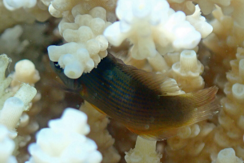 The Dusky Dottyback has very variable colors going from mainly yellow to very dark. They seem to like hiding in and under acropora corals. They could be mimicking other fish that are common in the corals. Amami 2025