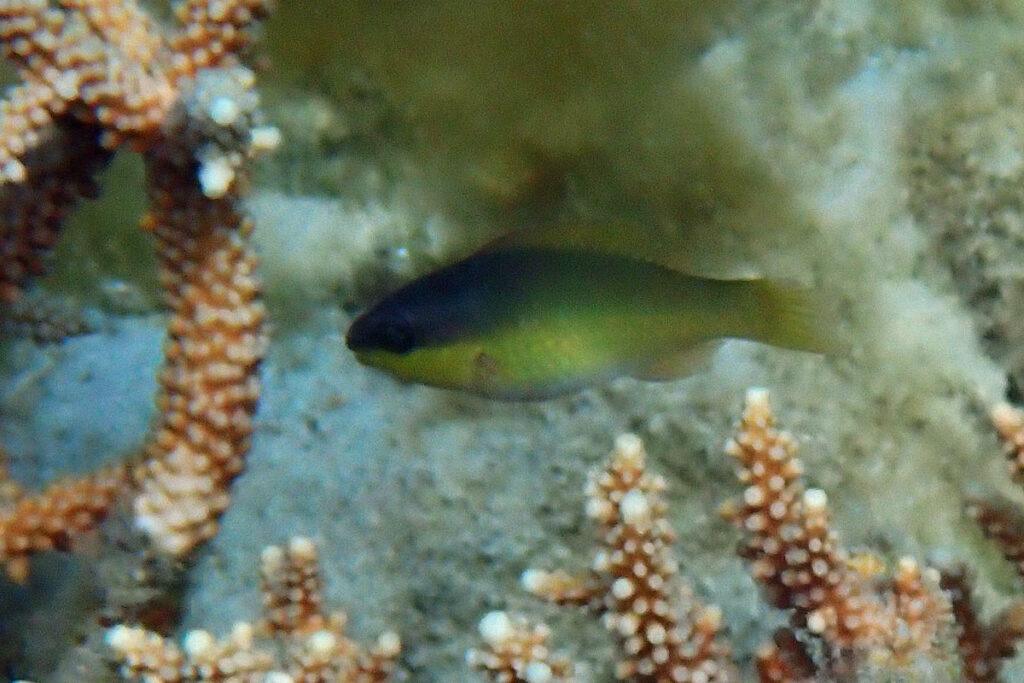 A juvenile Egghead Parrotfish hiding in the coral. Amami 2026