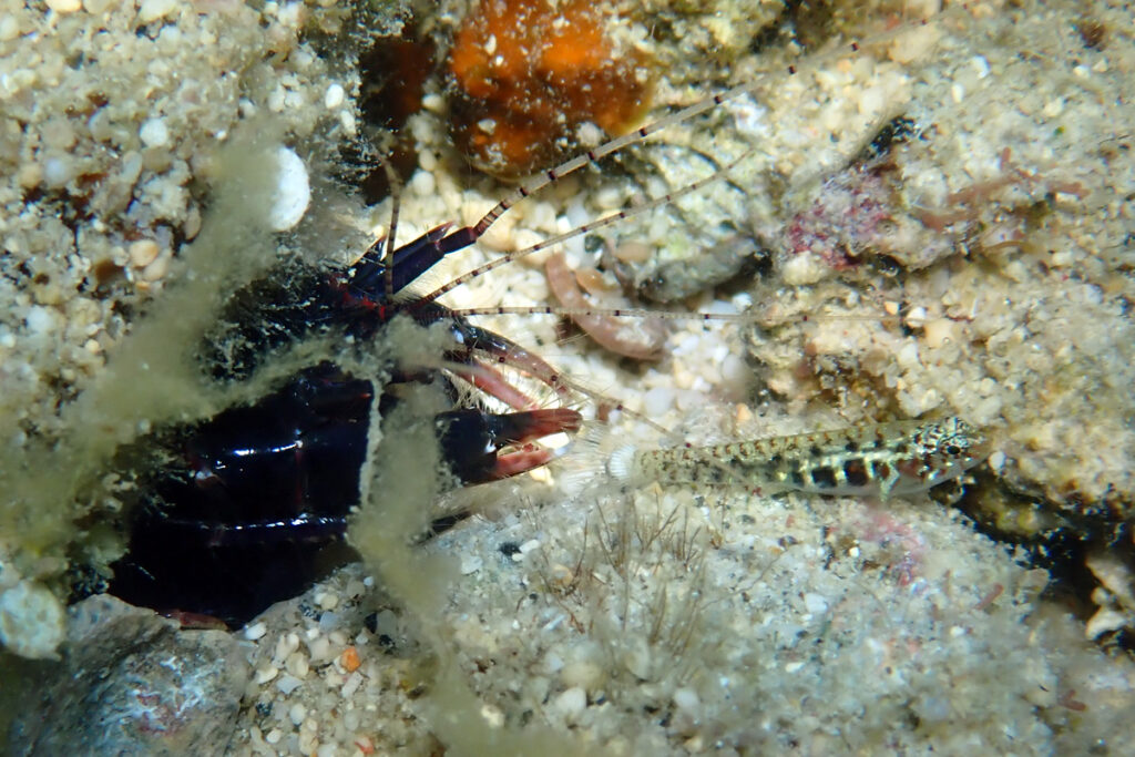 The mystery goby was next to a mystery crustacean too. Shrimp gobies are often found with snapping shrimp. Snapping shrimp don’t have hairs on the pincers. I am thinking that this is a Serrated Lobster Shrimp (Axiopsis serratifrons) ヘンゲアナエビ – size 6cm. There is not much information on that or good pictures. They are found circumtropical. Amami 2025