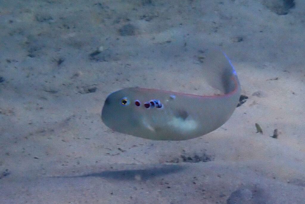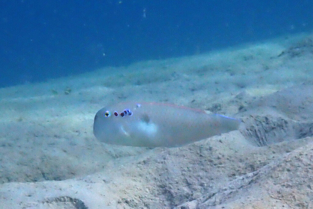 The Fivefinger Razorfish is found in sandy areas. It looks for food in the sand and dives into the sand to hide. They are shy and hard to approach. It has a light spot in the middle with a smaller dark spot above. Larger ones have red scales behind the eye that appear black at depth. Amami 2025