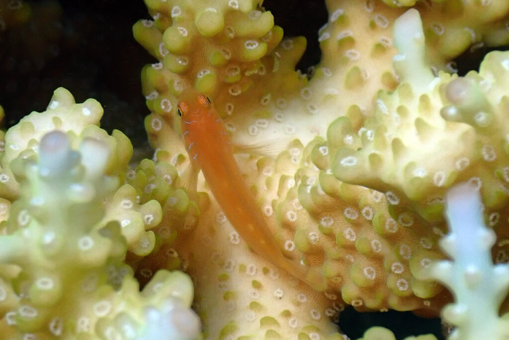 The Fiveline Coralgoby is found in Acropora Coral. It is orange with five or six vertical lines on the head. The back half of the fish can be black. Amami 2025