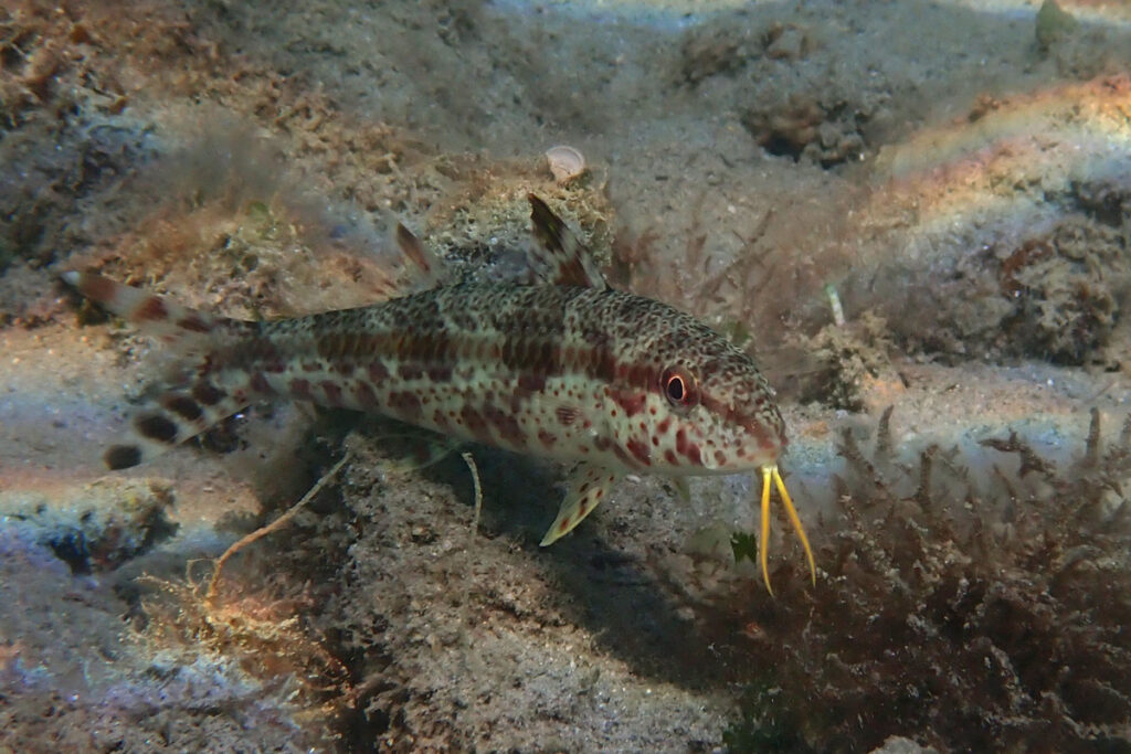 The Freckled Goatfish has a lot of freckles, a stripe from nose to tail and alternating light and dark bars on the tail. The reddish blotches on the bottom of this fish can come and go. Amami 2023