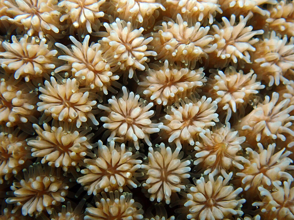 Galaxea is a genus of coral. The polyps can be about 1cm and the colonies can exceed 5 meters across. These were smaller colonies possibly Galaxea fascicularis since their tentacles were extended in the daytime. Amami 2023