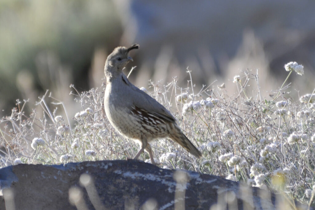 The female Gambel’s Quail is plainer. This one is on lookout duty in Kingman. Arizona 2012