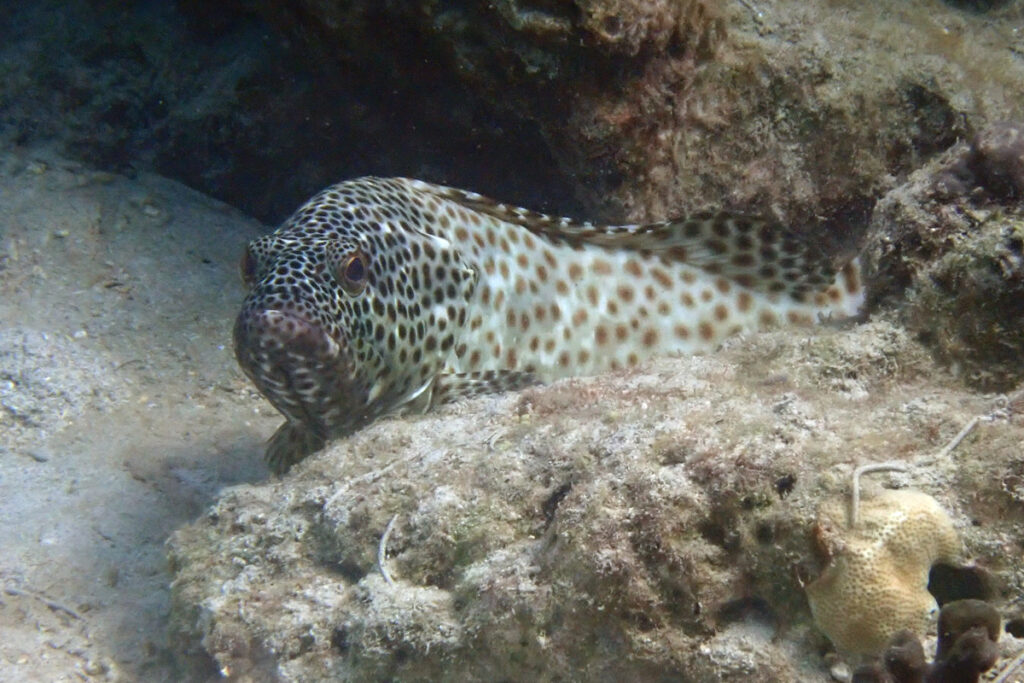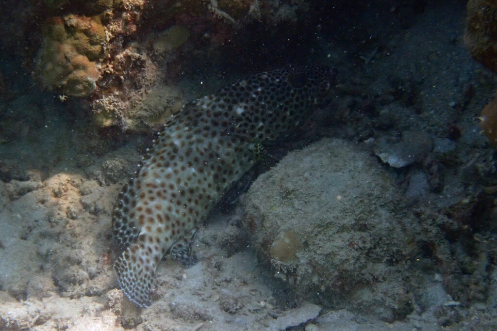 The Greasy Grouper has dark round spots that are well separated. There are scattered light blotches in the head area, and the base color has light and dark diagonal bands that can vary in contrast. There are several very similar species. Amami 2025