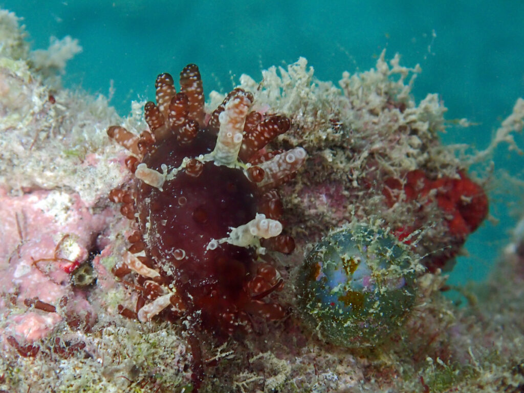 This is a live Limacina Cowry. I did not see the shell, but the mantle is I think enough. There is similar Staphylaea staphalaea with a black and white mantle. If you don’t see it, look to the left of the Bubble Algae. Amami 2026
