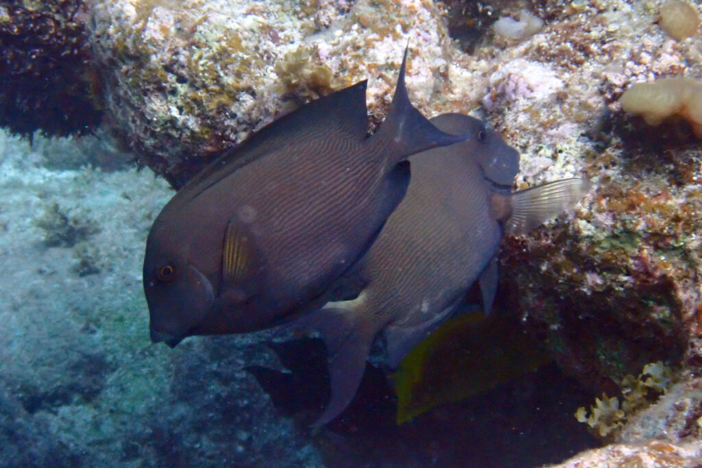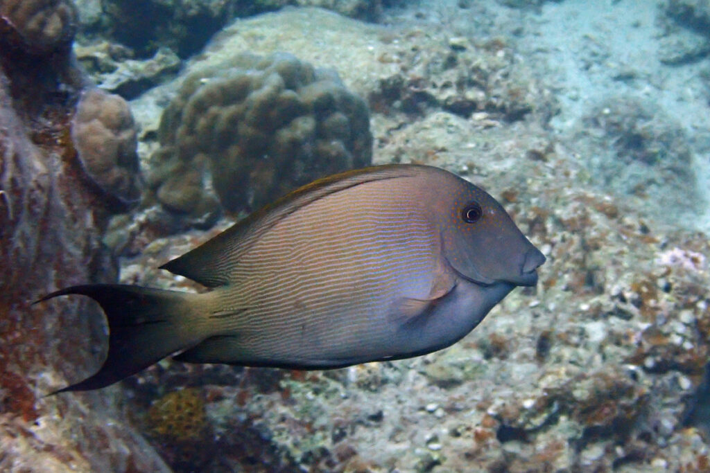 The Lined Bristletooth is a midsized surgeonfish that is often overlooked. They can be light or dark. They have fine lines and dots on the head. The dots fade as they get bigger. They graze mostly unnoticed among the more colorful fish. Amami 2023