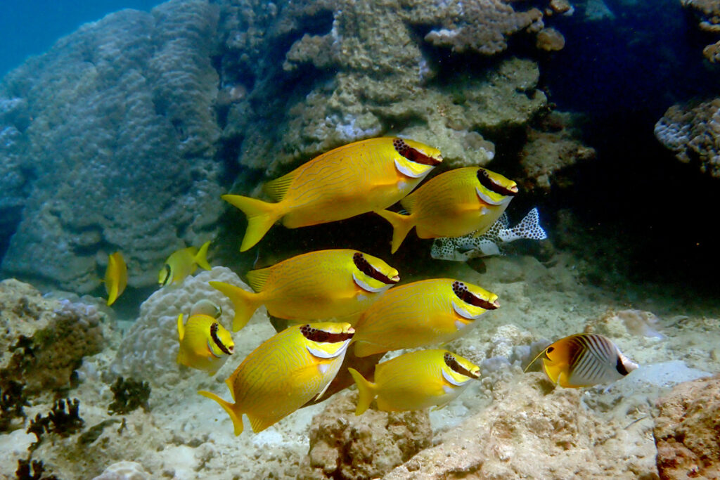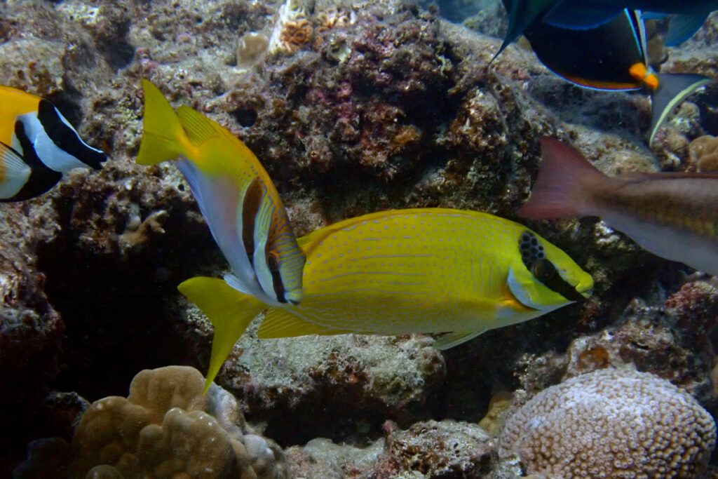 Masked Rabbitfish are often in mixed schools of fish. Here there is a Doublebar Rabbitfish, Blackblotch Foxface Rabbitfish and other fish together. Amami 2024