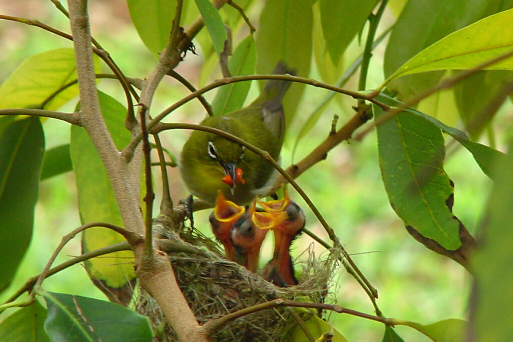 This Mejiro was nesting in a Lychee tree next to my house. The chicks are getting a very hot chili pepper. The peppers don’t bother the birds. I spent a lot of time in that tree for this picture. Kauai 2002