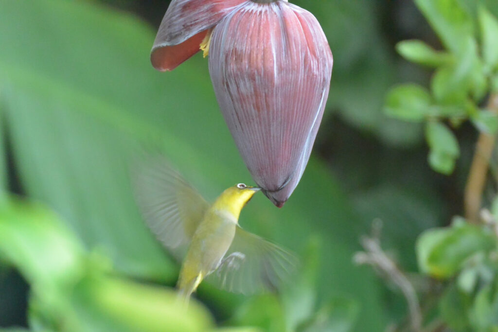Mejiros can hover and suck nectar from banana flowers. Kauai 2019