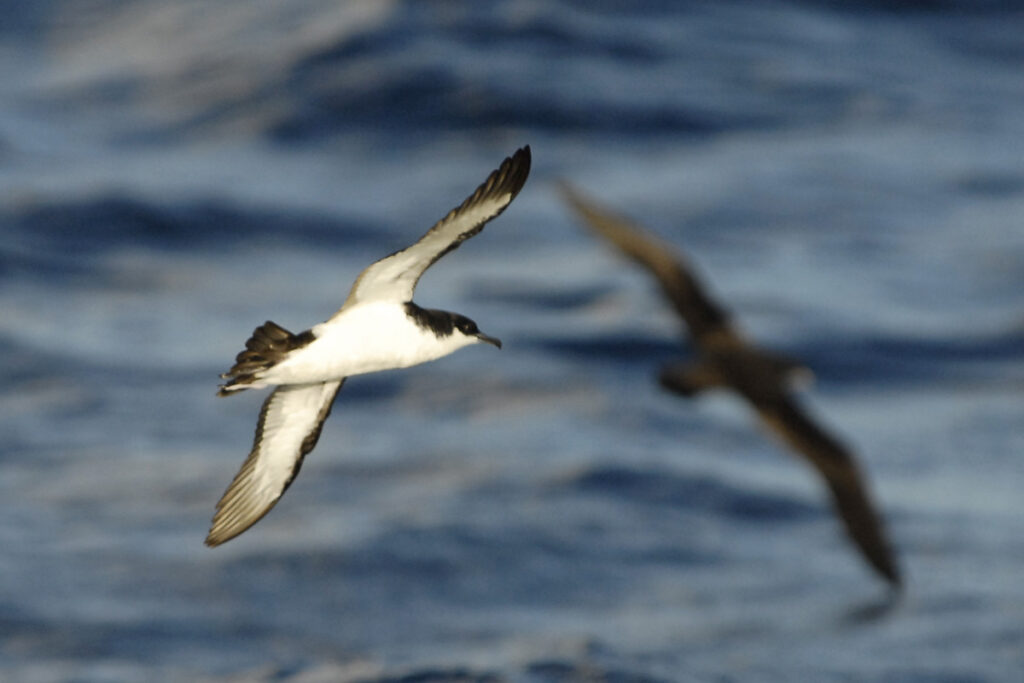 Newell’s Shearwater low over the water. They are seen flying with Wedgetail Shearwaters occasionally. There are few of them and hard to see among the Wedgetails. Kauai 2009