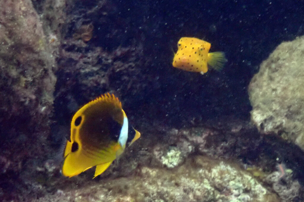 A juvenile Racoon Butterflyfish has an extra spot in the back. Also, a juvenile Yellow Boxfish. Amami 2025