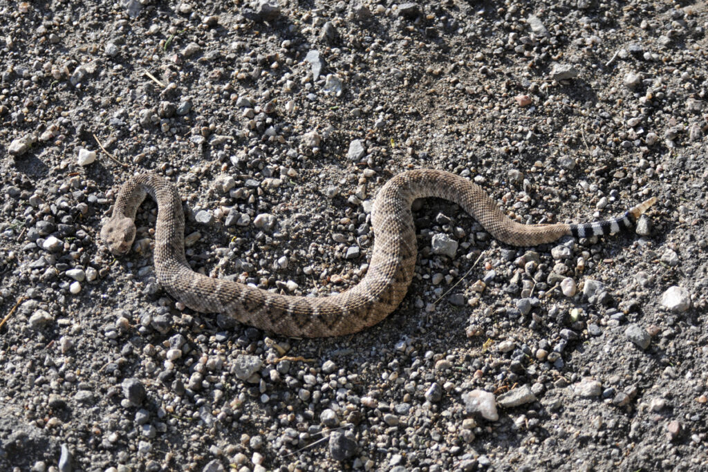 The Western Diamond-backed Rattlesnake has wider black rings by the tail. It also has a bit of a reddish tinge to its body. This snake was a roadkill in Kingman. Arizona 2012