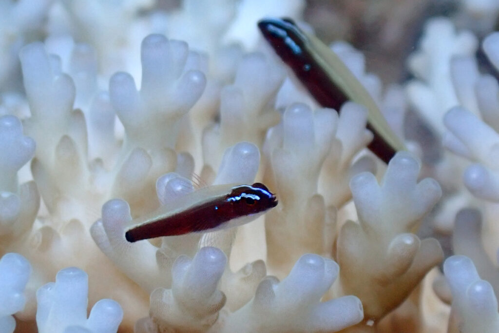 A Redbelly Dwarfgoby in coral. They are small and like to stay in the safety of the coral branches. I am not sure about the redbelly name maybe in shallower water they look red. The belly is somewhat clear and may look red it you could look up at them. That could be hard to do with them on the coral. Amami 2025