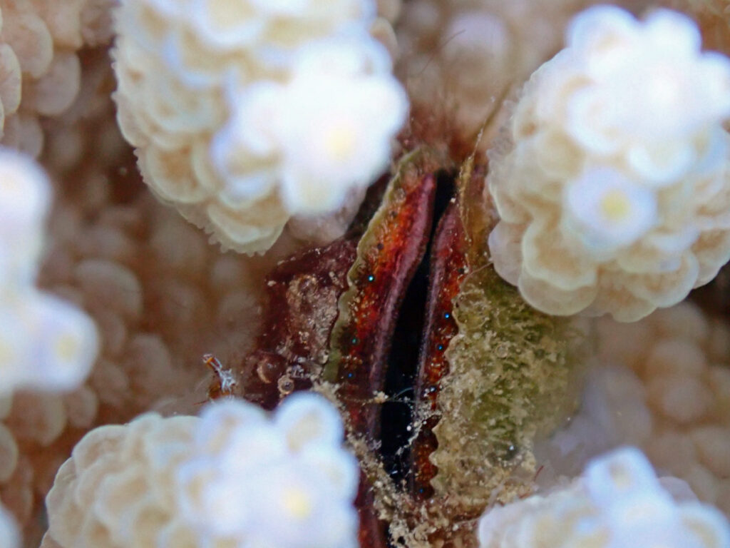 This Scallop with blue eyes is living in an Acropora Coral. Amami 2025
