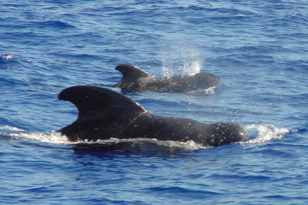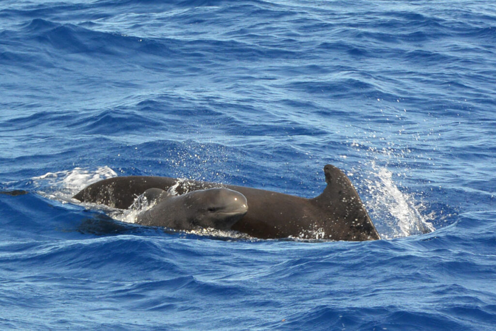 Short-Finned Pilot Whale mother and calf pair moving fast. Notice that the mother has a more normal looking dorsal fin. Kauai 2022
