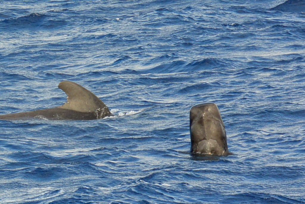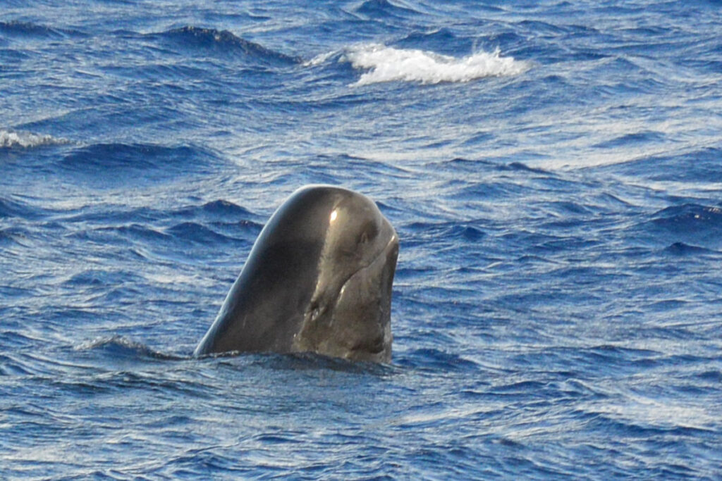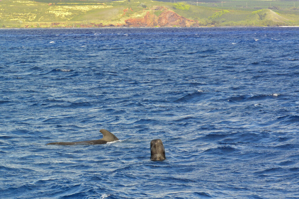 A Short-Finned Pilot Whale spy hopping in front of Nomilu Pond. Kauai 2017