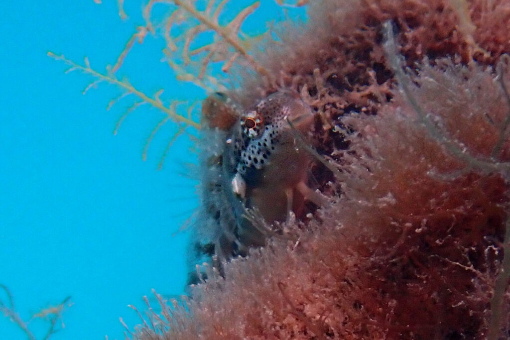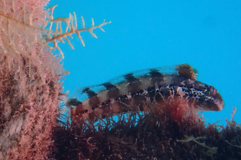 This could be a Shorthead Fangblenny or a Variable Sabertooth Blenny (Petroscirtes variabilis) イヌギンポ. They can look much alike each other. Amami 2026