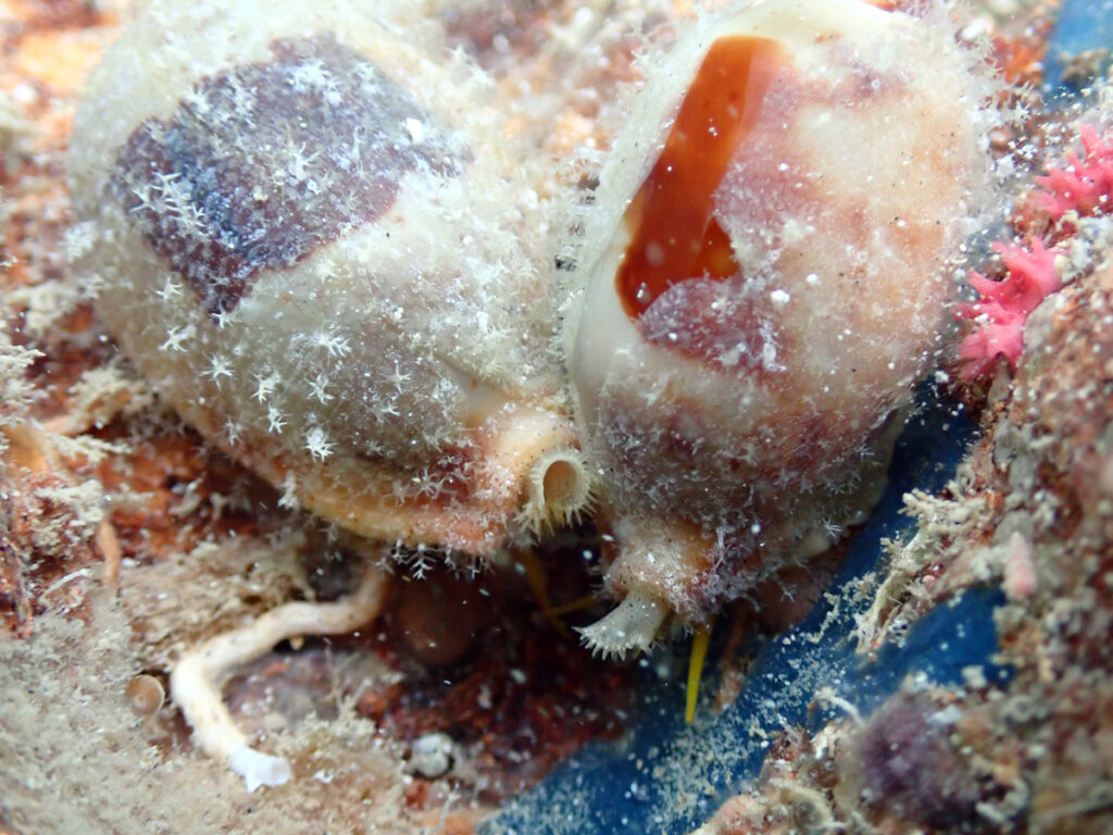A pair of live Stolid Cowries. The mantle is white and transparent enough to identify them even when totally covering the shell. Amami 2026