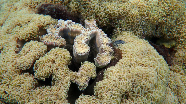 A juvenile Twospot Surgeonfish has a yellow tail and a blue ring around the eye. Amami 2024