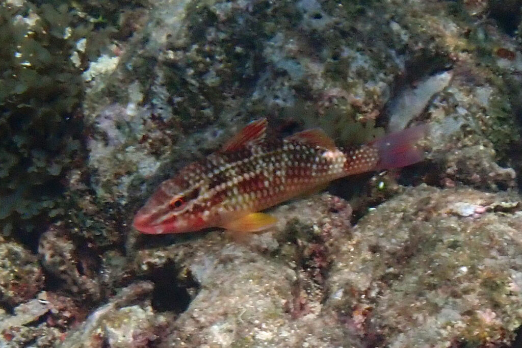 Whitesaddle Goatfish at rest can be darker and mottled. Amami 2025