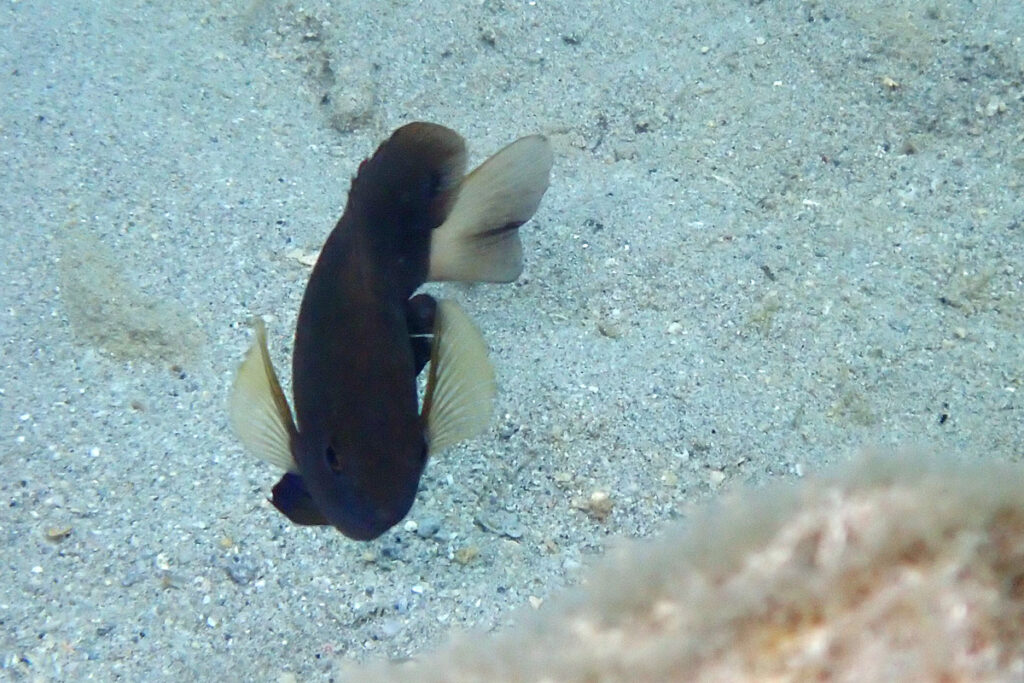 An adult Whitetail Damsel still has a whitetail and a spot, but the red and blue have become dark. Amami 2023