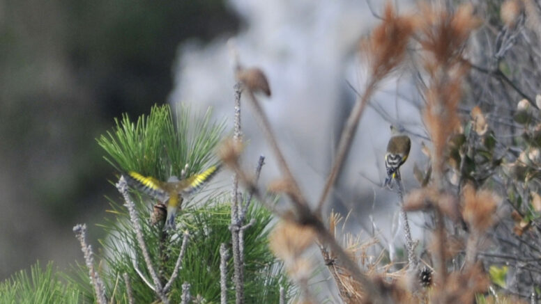 Oriental Greenfinch – カワラヒワ Oriental Greenfinch (Chloris sinica) カワラヒワTwo Oriental Greenfinchs in a distant tree. Izu 2012 Two m... 2025.10.30